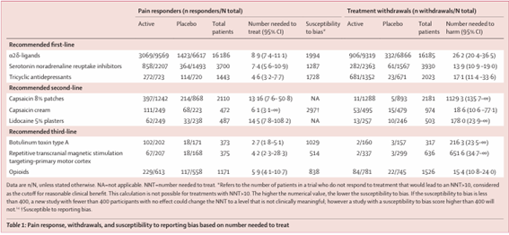 一方、number needed to harm(NNH)は害必要数と訳されるとおり、何人の患者に投与すれば1人に有害事象が確認できるかを意味します。つまり安全性を比較する指標で、大きい値ほど忍容性が高いことを意味します。これも有害事象の定義により値は変化しますが、この研究では副作用による内服中止と定義しています。NNHは表の右端に記載がありますが、α2δリガンドでは26.2、三環系抗うつ薬では17.1ですので、薬を継続しやすいのはα2δリガンドと評価できます。ただし個々の症例で副作用の感じ方も異なり、すべての神経障害性疼痛の症例でα2δリガンドから開始するかというとそう簡単ではありません。痛みの性質や患者さんの並存疾患なども考慮した薬物選択がなされます。神経障害性疼痛の患者ではfirst-line drugsとして、上段のα2δリガンド(プレガバリン、ミロガバリン、ガバペンチン)、SNRI(デュロキセチン)、三環系抗うつ薬(アミトリプチリン)が選択されることは覚えておきましょう。